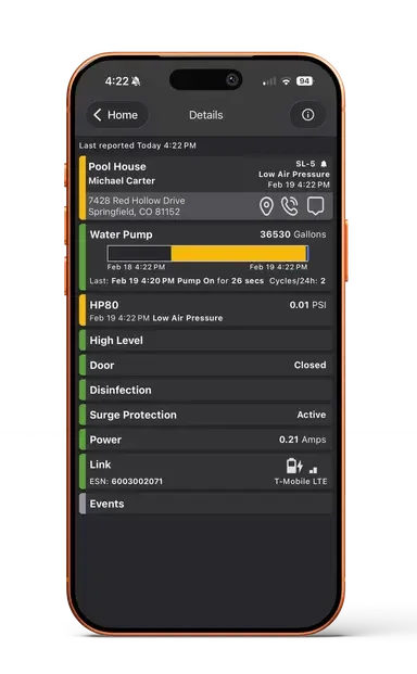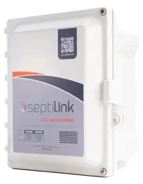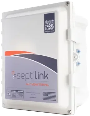Septilink is a remote monitoring system for residential and commercial septic systems. It tracks power use, pump activity, aerator pressure, and alarm conditions in real time — then sends instant alerts to your phone through the SLConnect app (available on iOS and Android) the moment something needs attention.